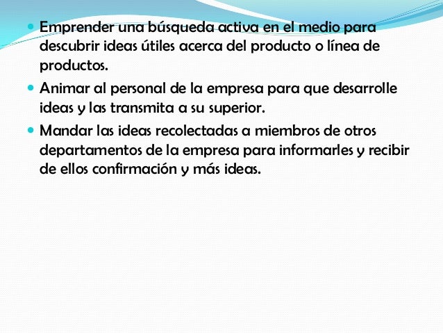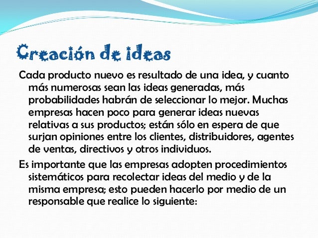Creación de ideas Cada producto nuevo es resultado de una idea, y cuanto más numerosas sean las ideas generadas, más probabilidades habrán de seleccionar lo mejor. Muchas empresas hacen poco para generar ideas nuevas relativas a sus productos; están sólo en espera de que surjan opiniones entre los clientes, distribuidores, agentes de ventas, directivos y otros individuos.Es importante que las empresas adopten procedimientos sistemáticos para recolectar ideas del medio y de la misma empresa; esto pueden hacerlo por medio de un responsable que realice lo siguiente:
