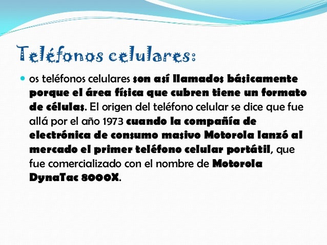 . Teléfonos celulares: os teléfonos celulares son así llamados básicamente porque el área física que cubren tiene un formato de células. El origen del teléfono celular se dice que fue allá por el año 1973 cuando la compañía de electrónica de consumo masivo Motorola lanzó al mercado el primer teléfono celular portátil, que fue comercializado con el nombre de Motorola DynaTac 8000X.